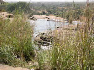 Nach einem kurzen Stück mit dem Motorrad sind wir bei den chutes de Karfiguela. Der kurze Fussweg führt durch eine herrliche Allee von riesigen, alten Mangobäumen. Hier unter den Bäumen ist es noch immer angenehm kühl. |