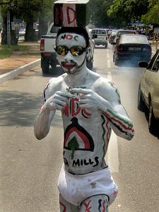 Auf dem Rückweg zum Hotel sehen wir überall Wahlpropaganda. Diese hier für die NDC ist die lustigste. Nach dem Foto gebe ich dem armen Kerl ein paar Münzen für einen kalten Drink. |
