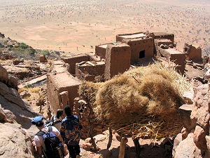 Nun beginnt der letzte Abschnitt unserer Tour. An der Falaise leicht bergauf erreichen wir die zwei quartiers von Pegue. Auch hier schöne Fotomotive und Tellem-Häuser am Kliff, das mittlerweile aber im Schatten liegt. |